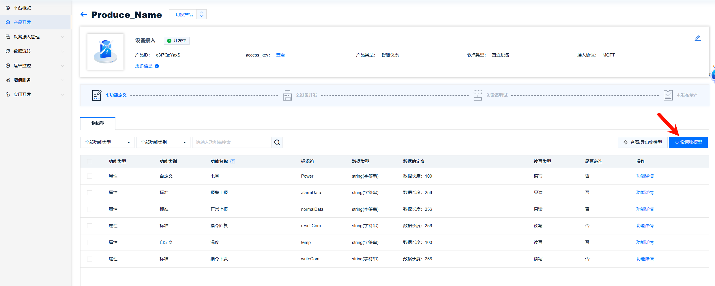 | res | products/g3f7QpYaxS/devices/produce1 | g3f7QpYaxS为产品ID,produce1为设备名 |